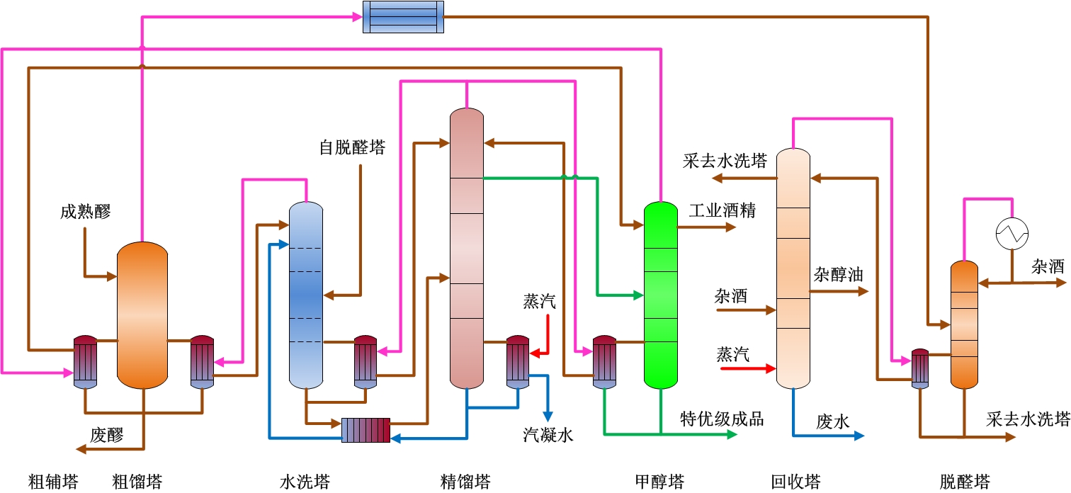 配置粗餾塔、水洗塔、精餾塔、甲醇塔、回收塔、脫醛塔,其中精餾塔采用蒸汽供汽,精餾塔塔頂酒汽供熱水洗塔和甲醇塔,水洗塔和甲醇塔塔頂酒汽供熱粗餾塔,回收塔塔頂酒汽供熱脫醛塔,粗餾塔和脫醛塔塔頂酒汽預熱成熟醪。
